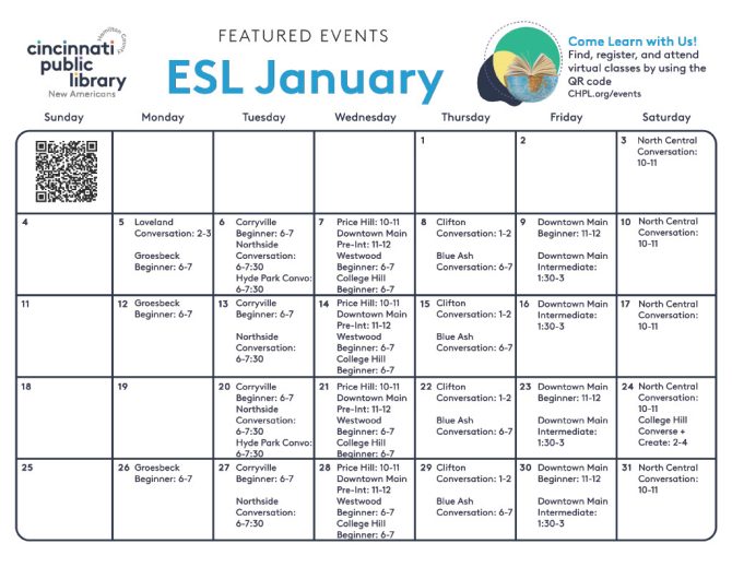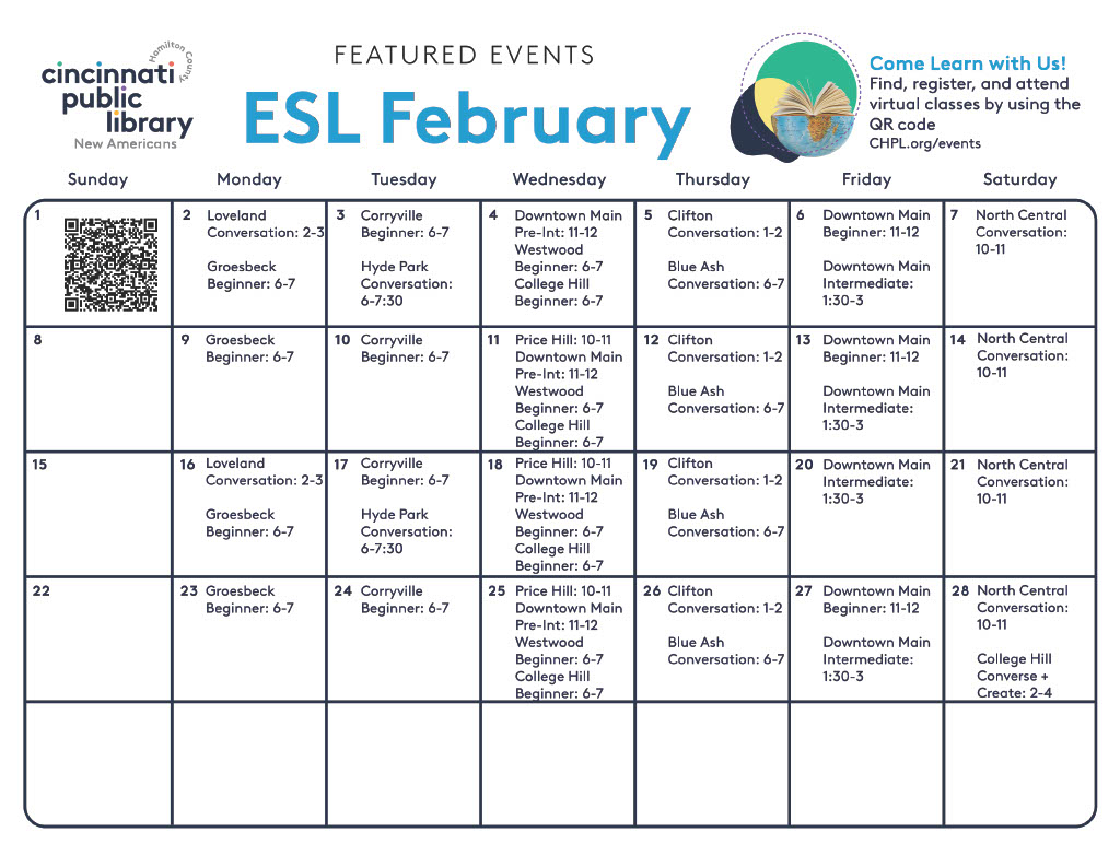 The Library hosts free English for Speakers of Other Languages (ESOL) events at multiple library locations. Join classes, in-person chats, and more!