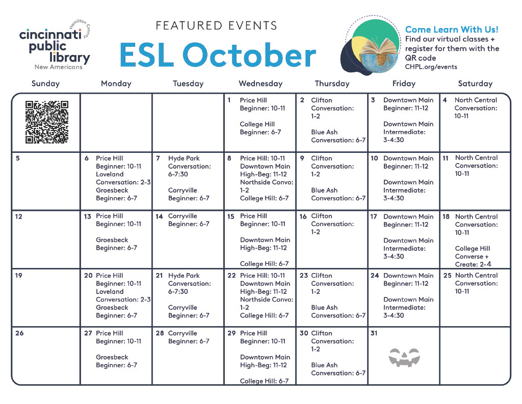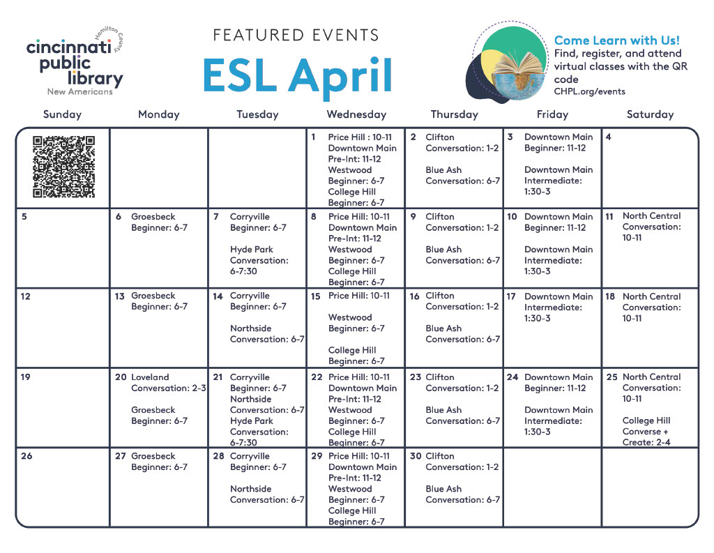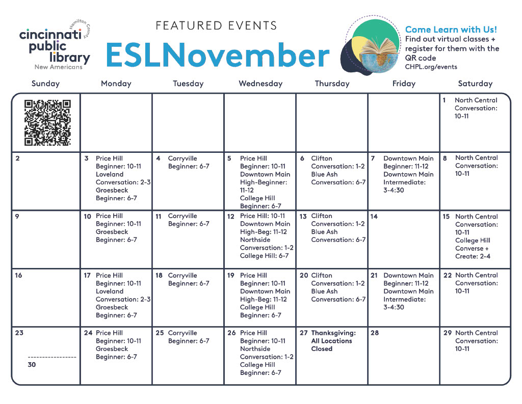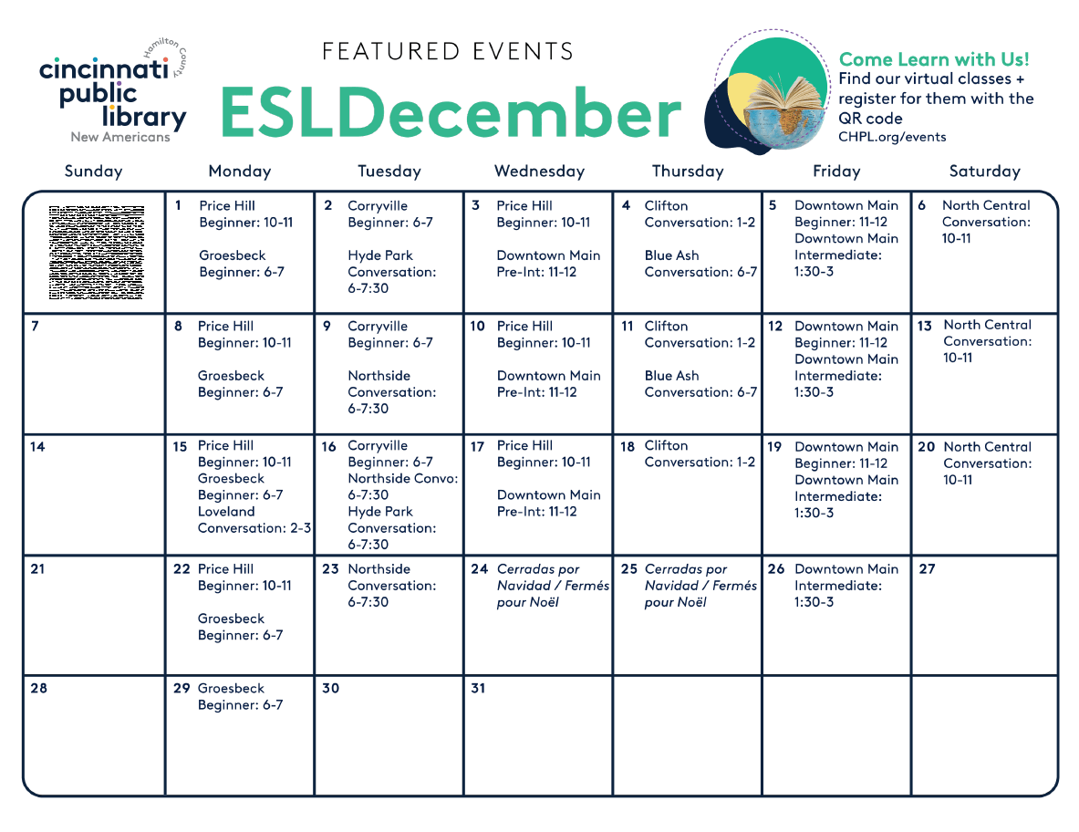 The Library hosts free English for Speakers of Other Languages (ESOL) events at multiple library locations. Join classes, in-person chats, and more!